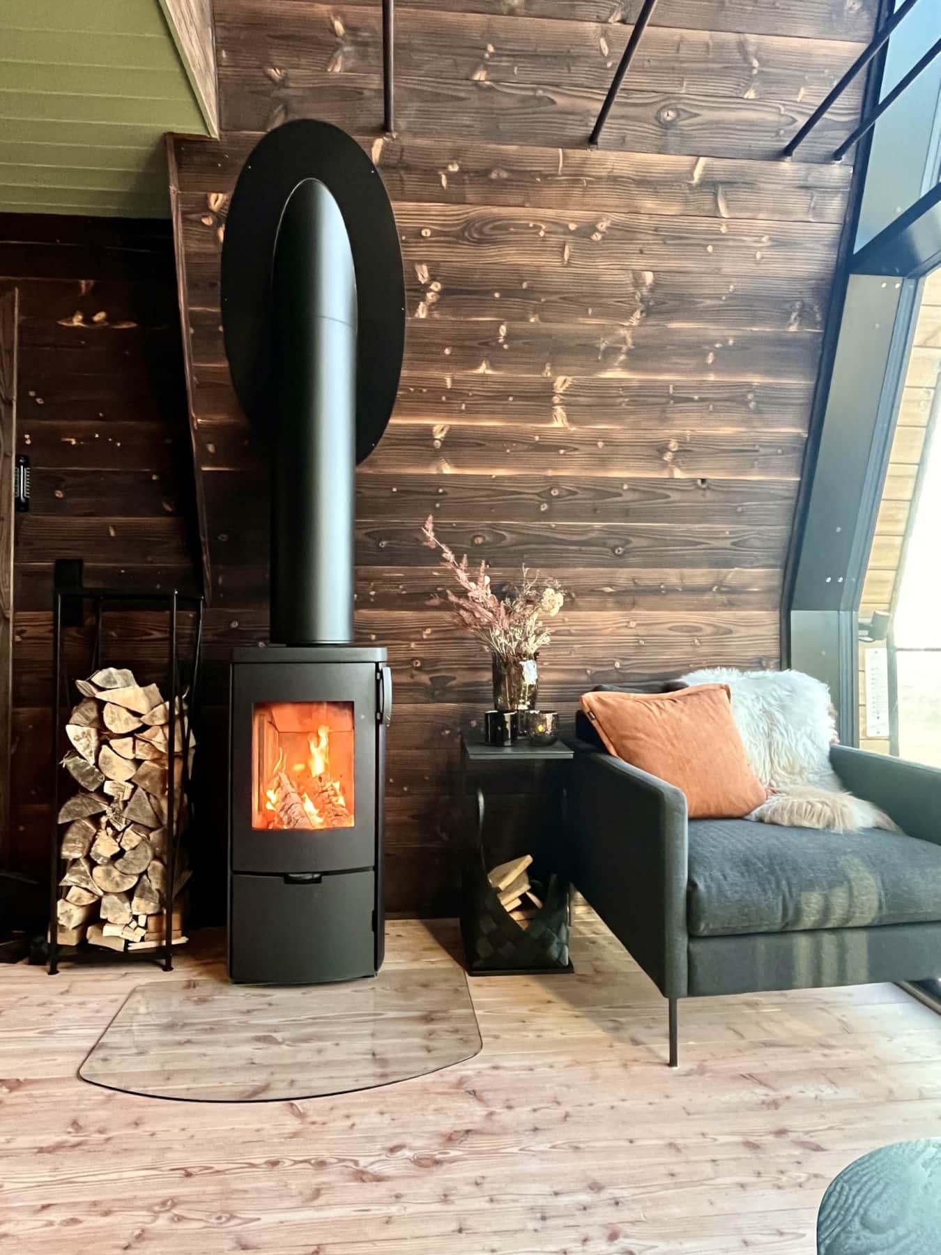 Steffi Stølen nytter vedfyring som varmekjelde. Vedfyring skapar ei heilt eiga stemning, særleg på seine kveldar. Den mjuke knitringa frå elden, det varme lyset og den lune varmen gjer rommet ekstra koseleg og innbydande. Perfekt for lange samtalar, ei god bok eller berre stille stunder etter ein dag ute i naturen.