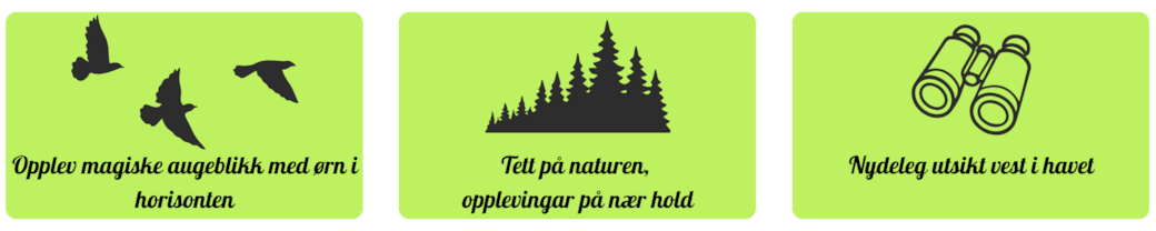 Samspel mellom høgda i tretoppane og den opne horisonten mot havet gjev både utsyn, perspektiv og ei kjensle av fridom – perfekt for å koble av frå kvardagen og berre vere til stades i nuet.